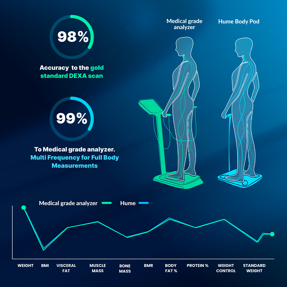 Get a full picture of your health like never before! With the Hume Pod, you can now easily understand how your body reacts to exercise, food and other factors so you can start making informed health choices. The science sounds simple, but actually doing this is difficult without an accurate view of your body's composition. Hume Pod can be your guide, so you never have to guess ever again.